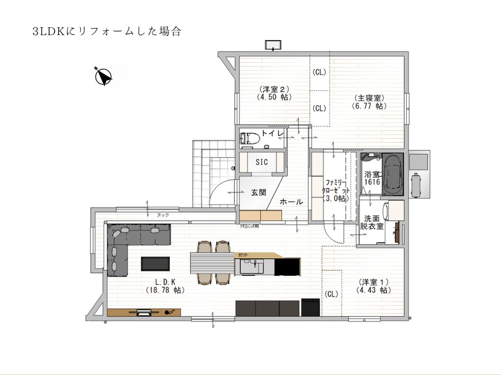 1LDKの基本の間取りから、家族の成長やライフスタイルの変化に合わせて2LDK~3LDKへとリフォームしやすく、永く暮らしやすさを考えた設計です。