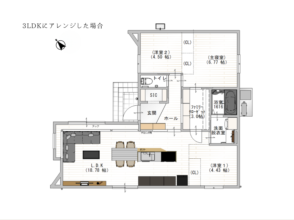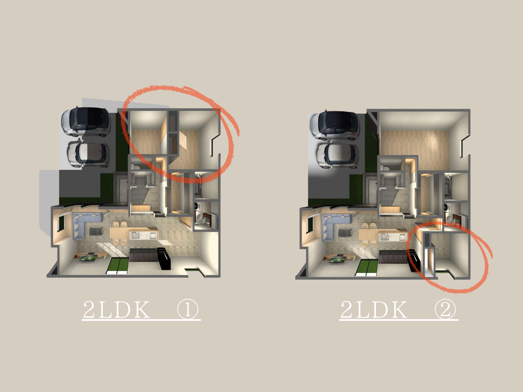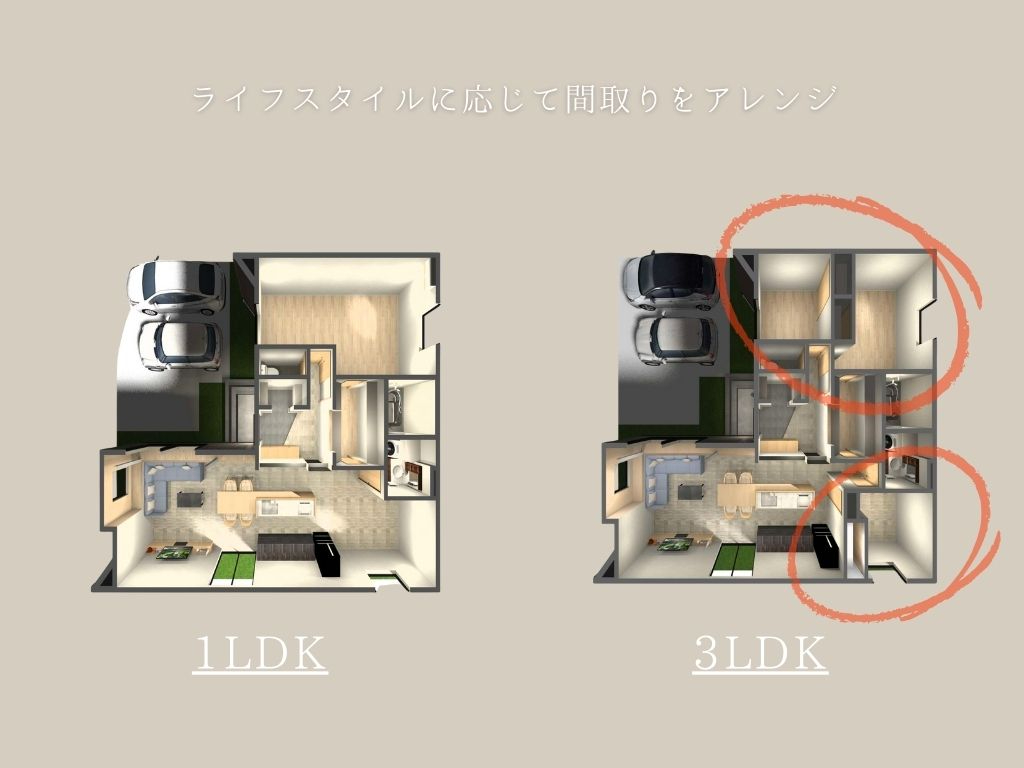 1LDKの基本の間取りから、家族の成長やライフスタイルの変化に合わせて2LDK~3LDKへとアレンジしやすく、永く暮らしやすさを考えた設計です。