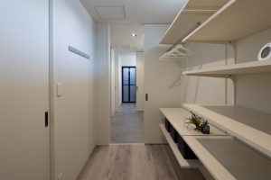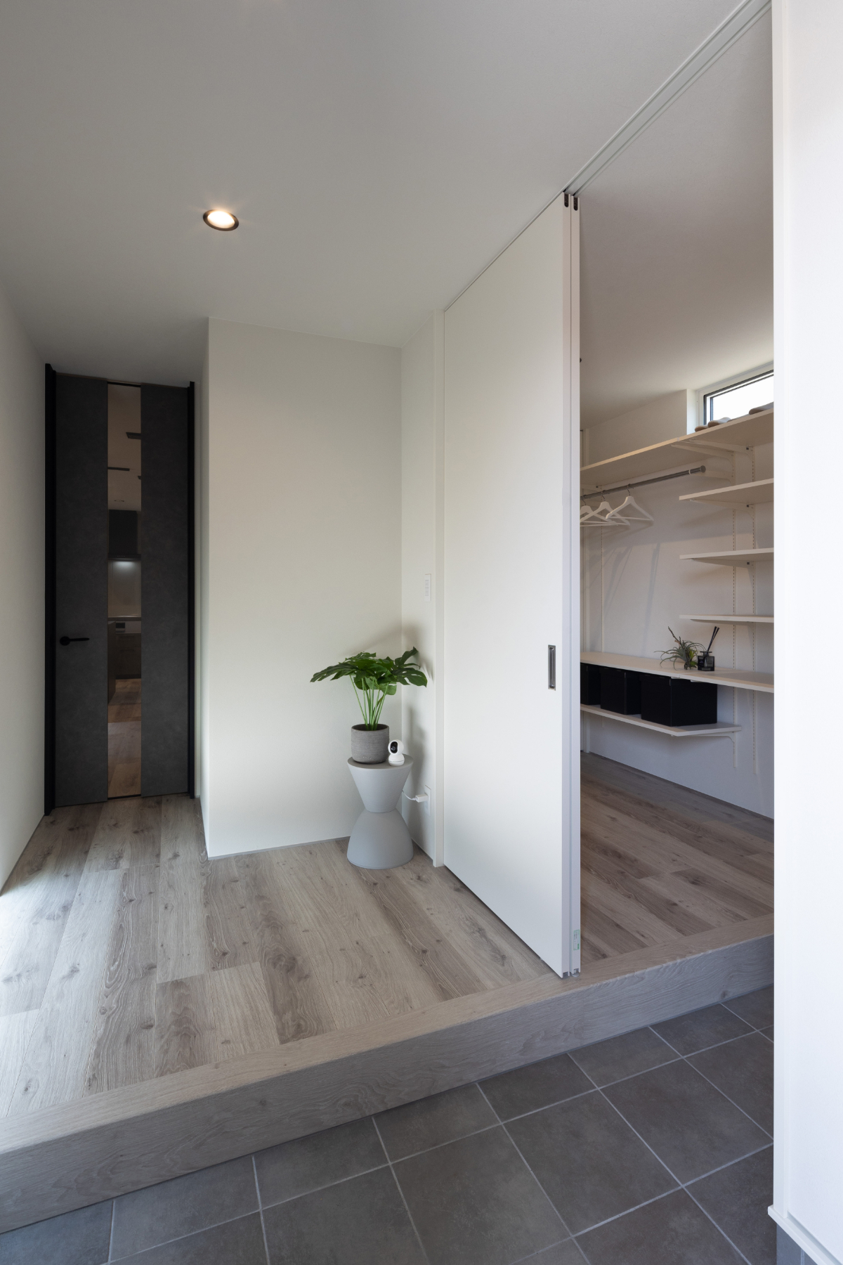 玄関はLDKと、シューズクロークから洗面室へ向かう2方向の回遊型。