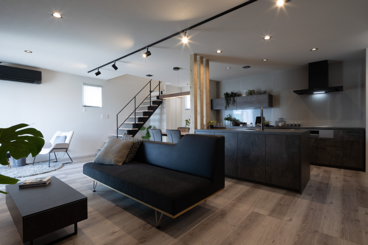 グレー×ブラックで統一された室内は、人気のグラフテクトキッチンをはじめ、高級感が漂うラグジュアリーな空間。