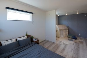 玄関キーはもちろんや電気スイッチ、エアコンのON/OFFなどをインターネットで管理できるIoTツールが付いたお家です。