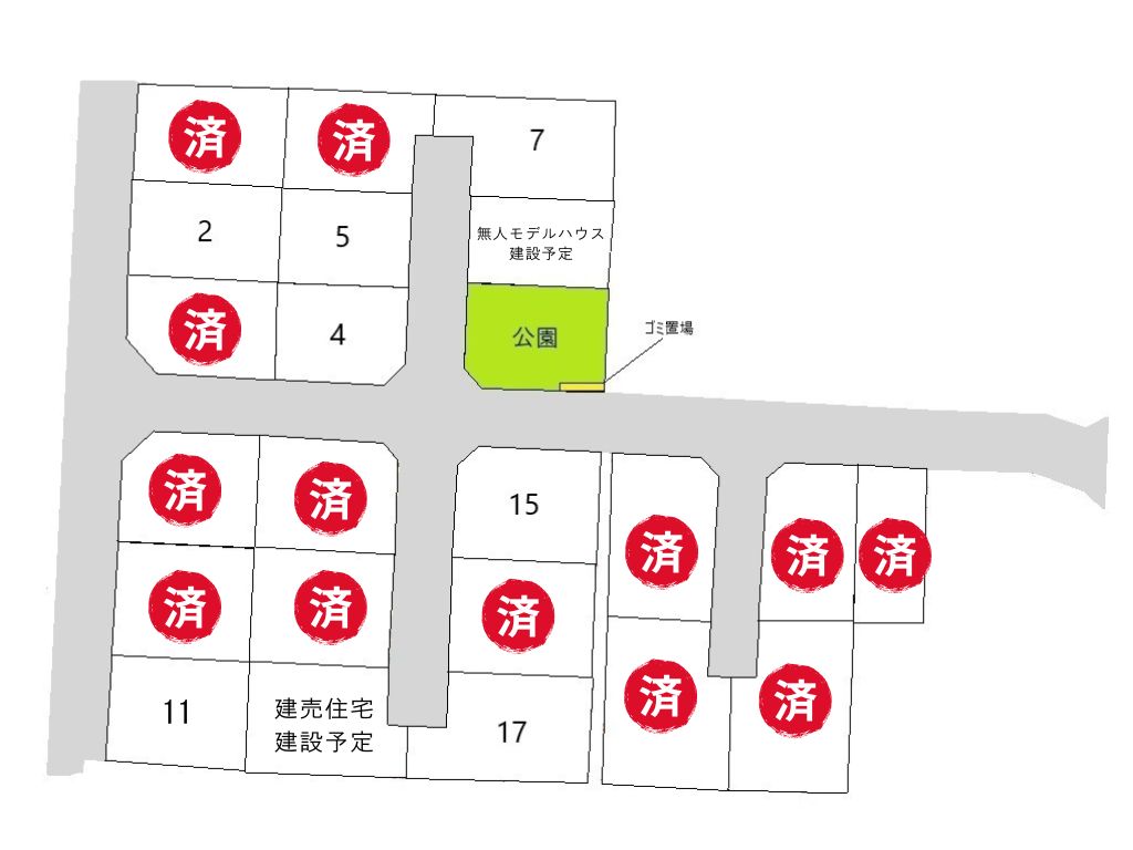 - 2号地 商談中/4号地 商談中/5号地 商談中/7号地/11号地/15号地/17号地/⑻モデル予定/⑿建売予定
