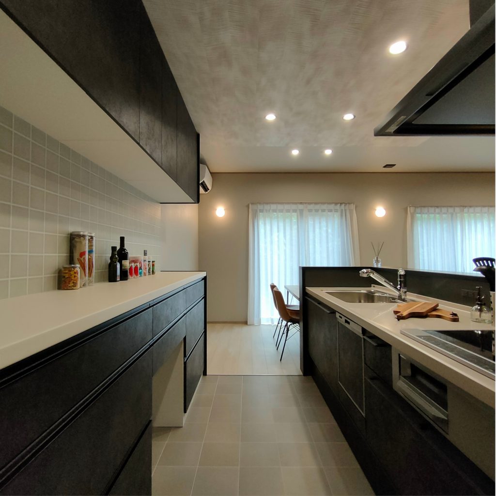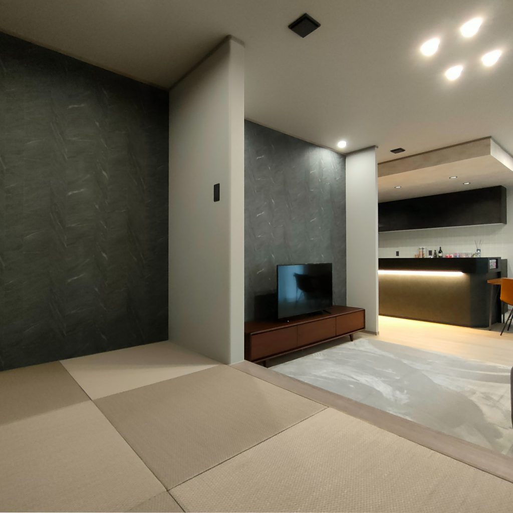 デザイン性だけでなく、日々の心地よさも追求。広々としたリビングの一角には、モダンな「畳コーナー」を配置しました。お子様の遊び場や家事スペースとして多目的に活用でき、スタイリッシュな空間の中に日本伝統の柔らかな安らぎを共存させています。