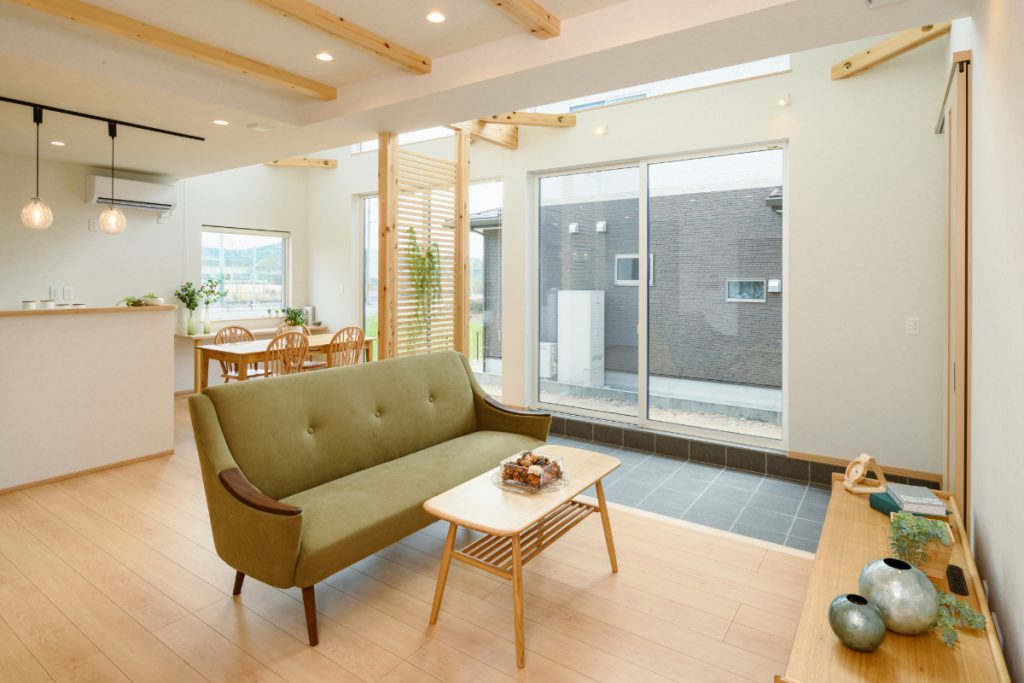 玄関の引き戸や、リビングの間仕切りに使われている格子など、「木」の質感を活かしたデザインが統一されています。 特にリビングの格子は、視線を緩やかに遮りつつも、光と風を通す機能的なアクセントに。