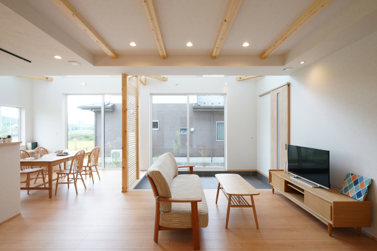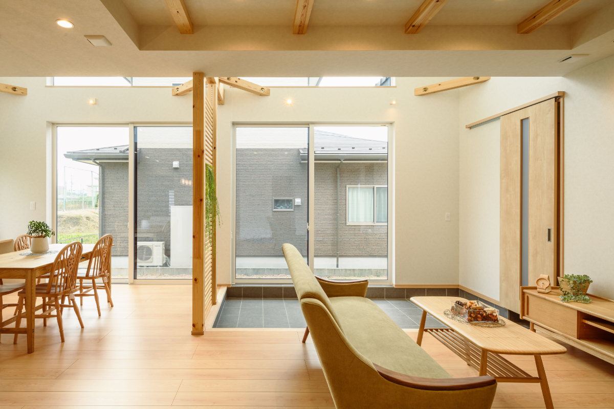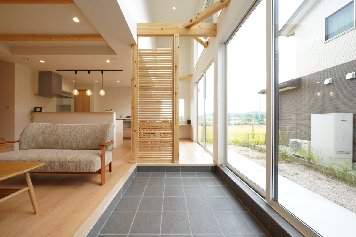 玄関の引き戸や、リビングの間仕切りに使われている格子など、「木」の質感を活かしたデザインが統一されています。 特にリビングの格子は、視線を緩やかに遮りつつも、光と風を通す機能的なアクセントに。