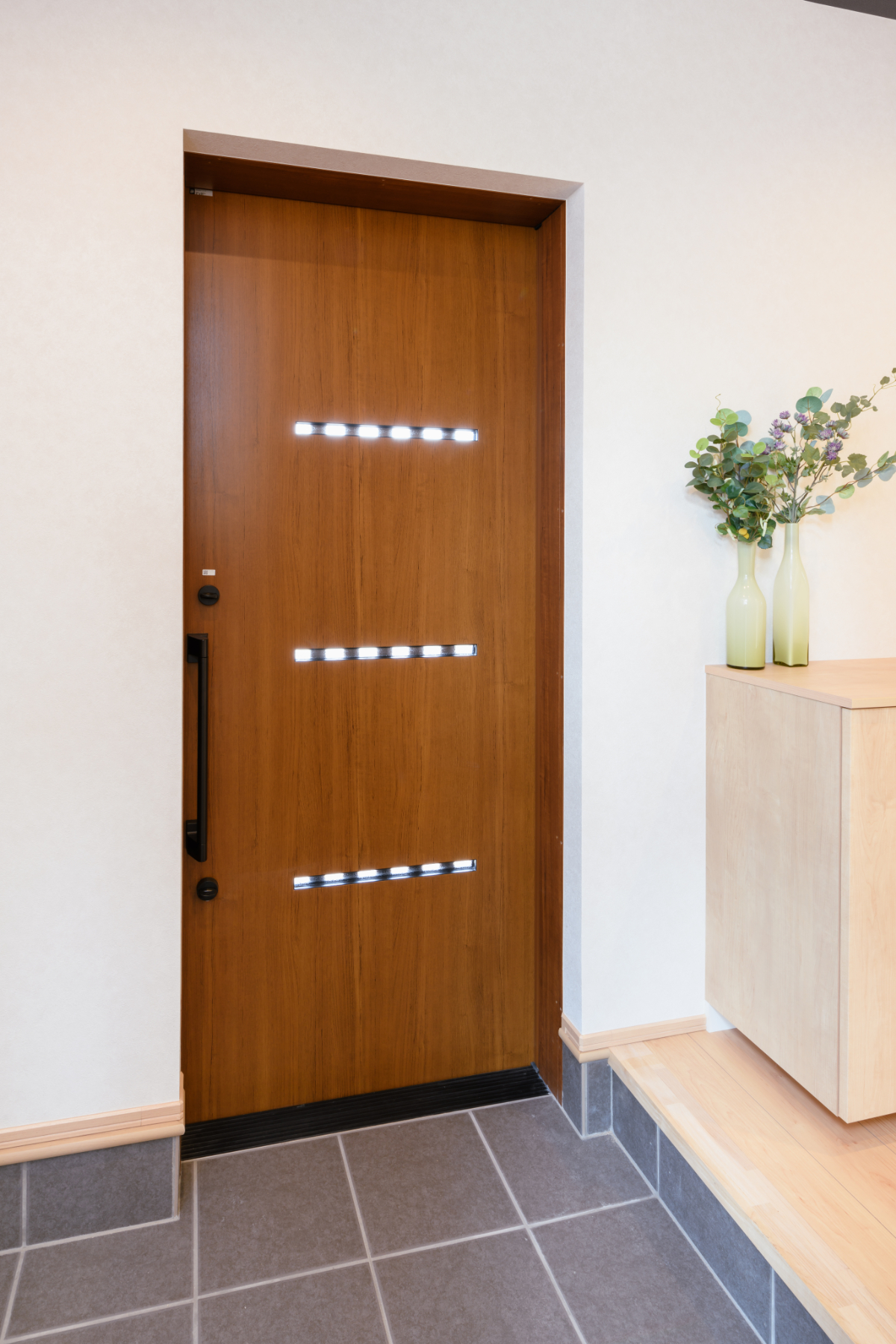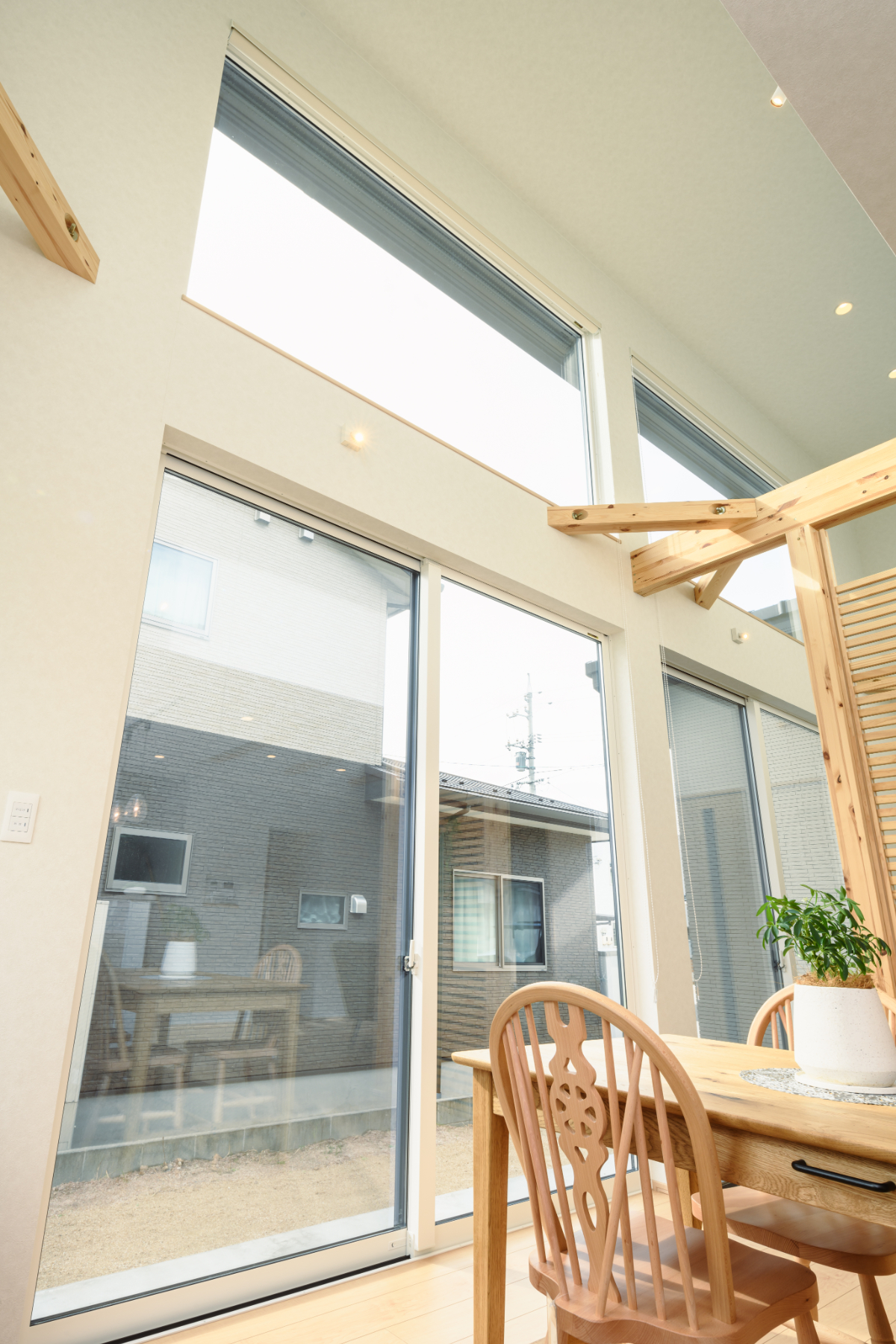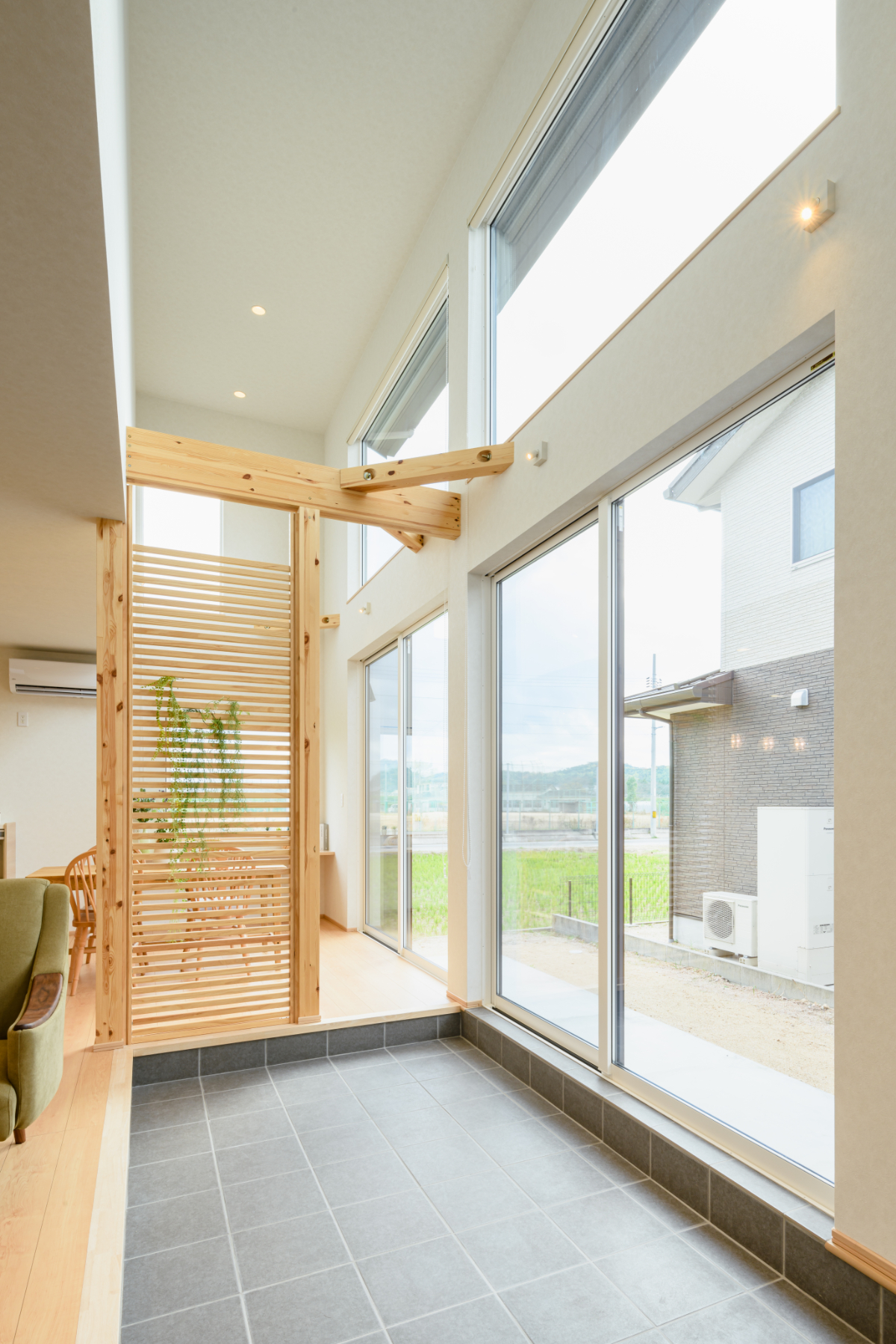 玄関の引き戸や、リビングの間仕切りに使われている格子など、「木」の質感を活かしたデザインが統一されています。 特にリビングの格子は、視線を緩やかに遮りつつも、光と風を通す機能的なアクセントに。