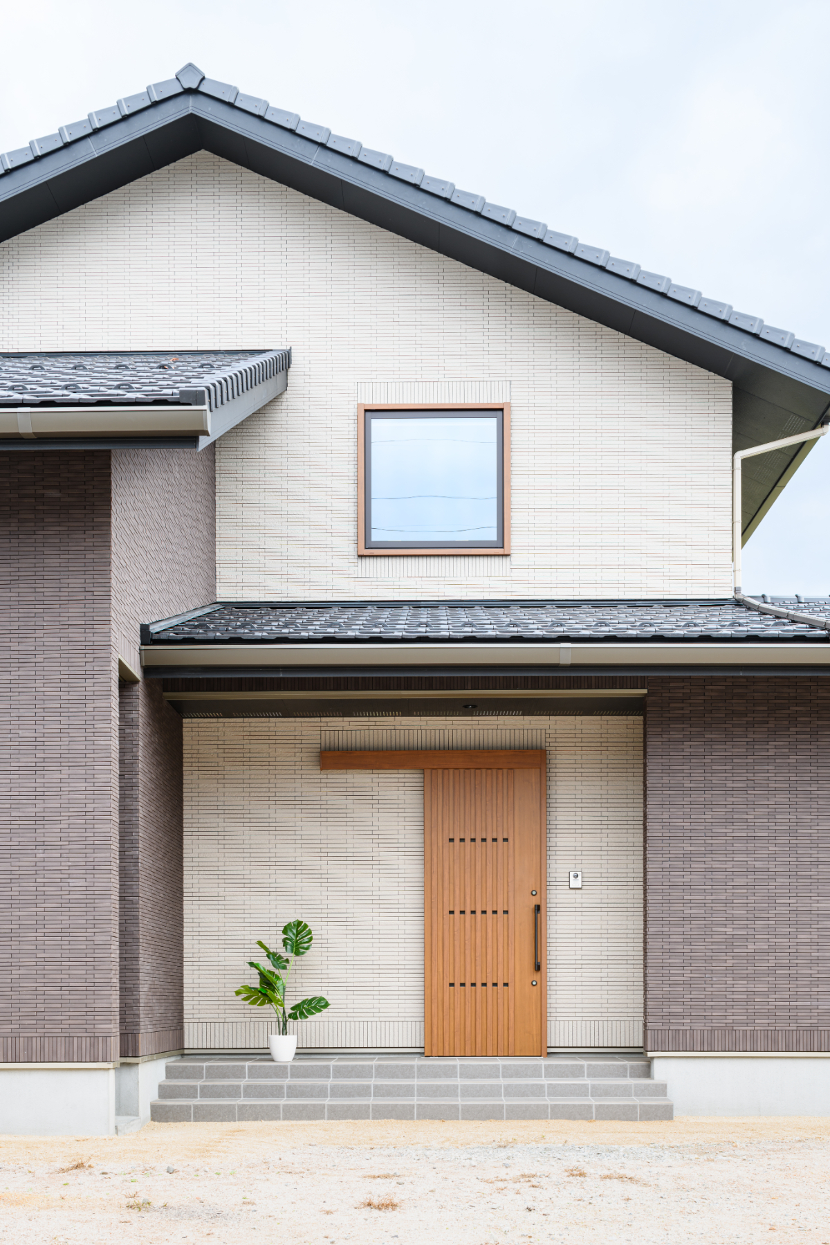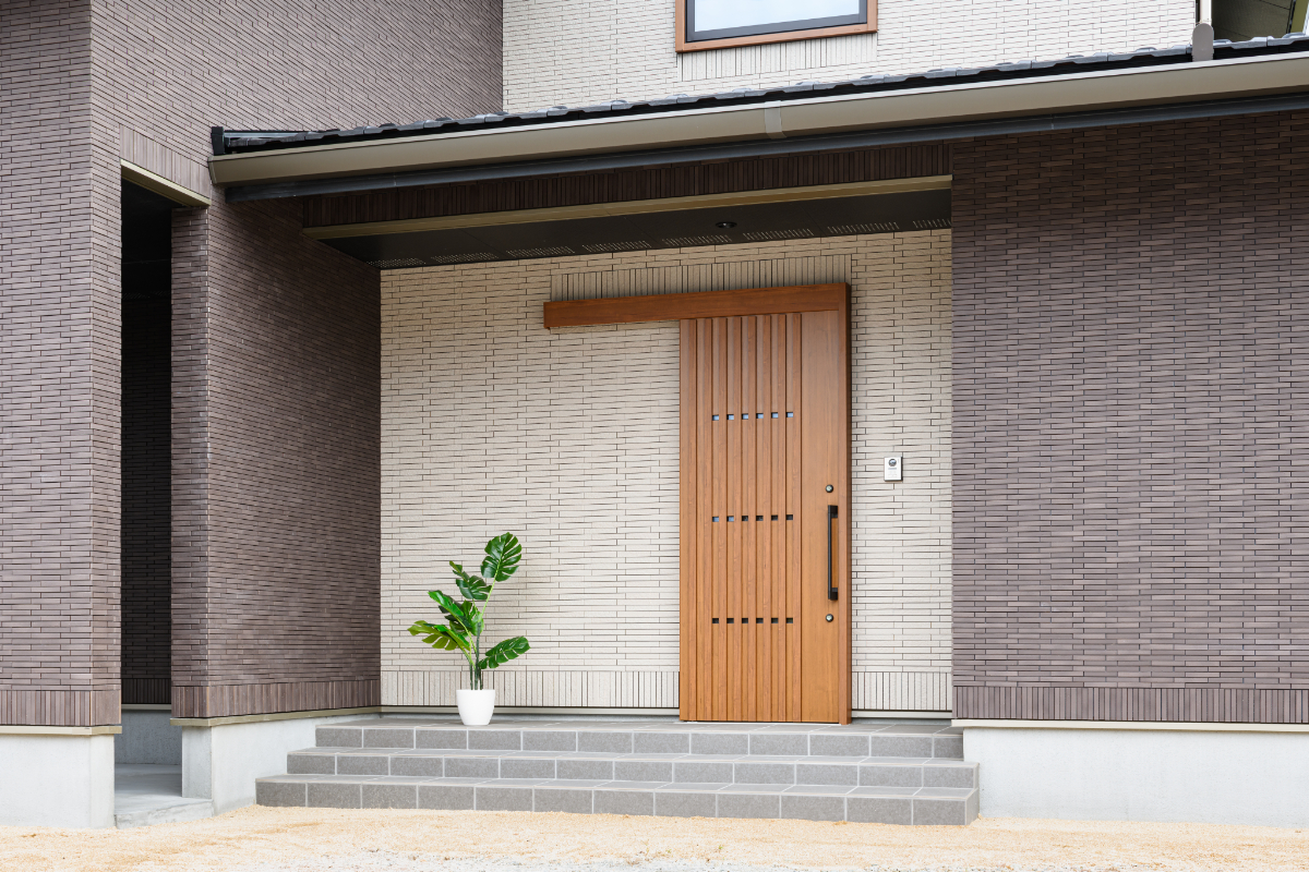クレバリーホームならではの「外壁タイル」を全面に採用。明るいオフホワイトと、重厚感のあるダークブラウンのタイルを貼り分けることで、建物全体に奥行きと洗練された表情を与えています。