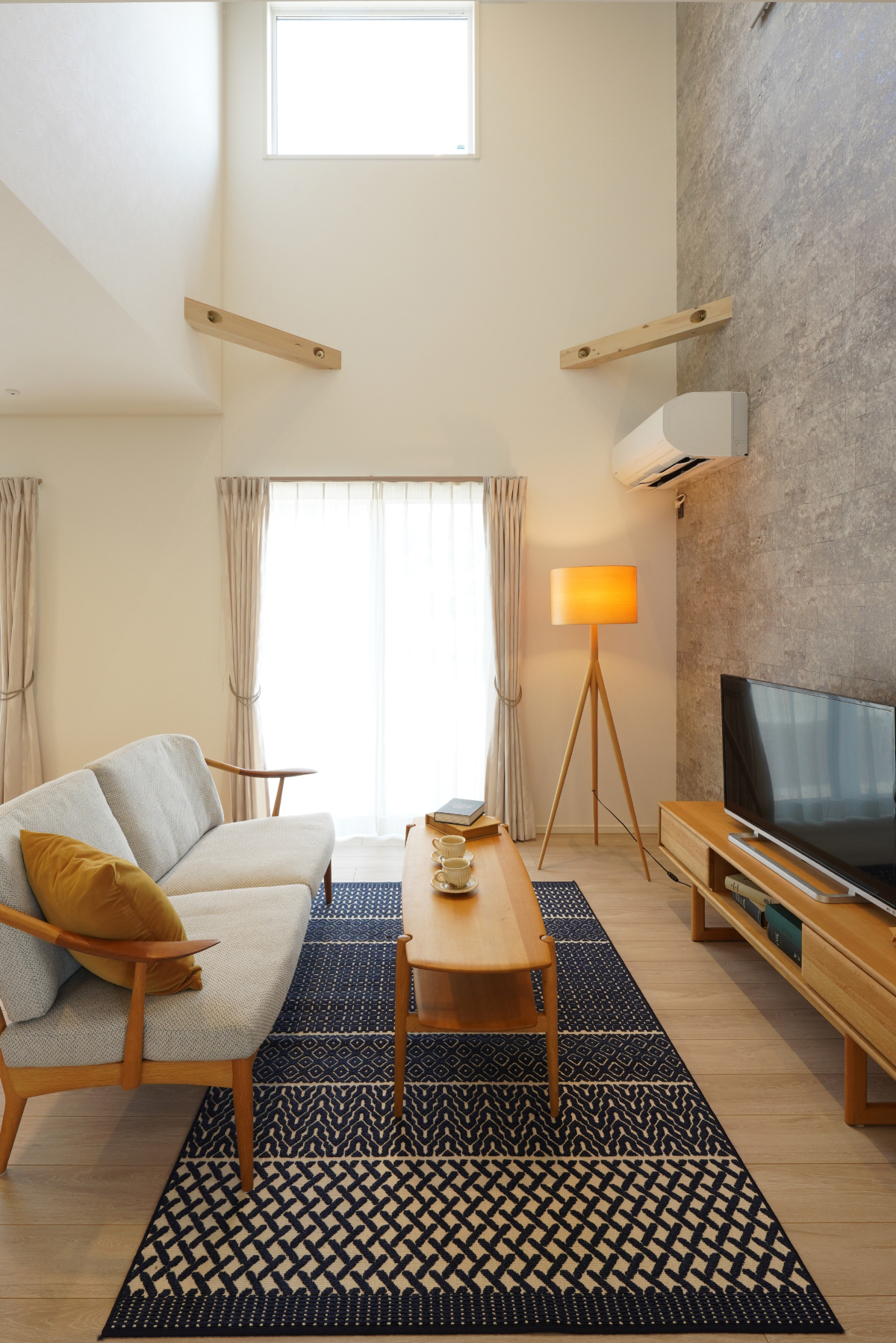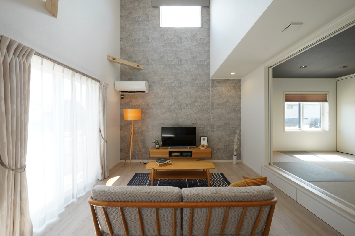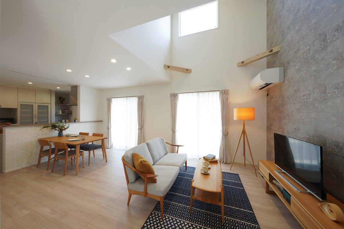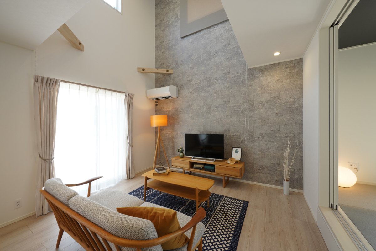 ■圧倒的な開放感を生む「吹き抜けとアクセントウォールのリビング」