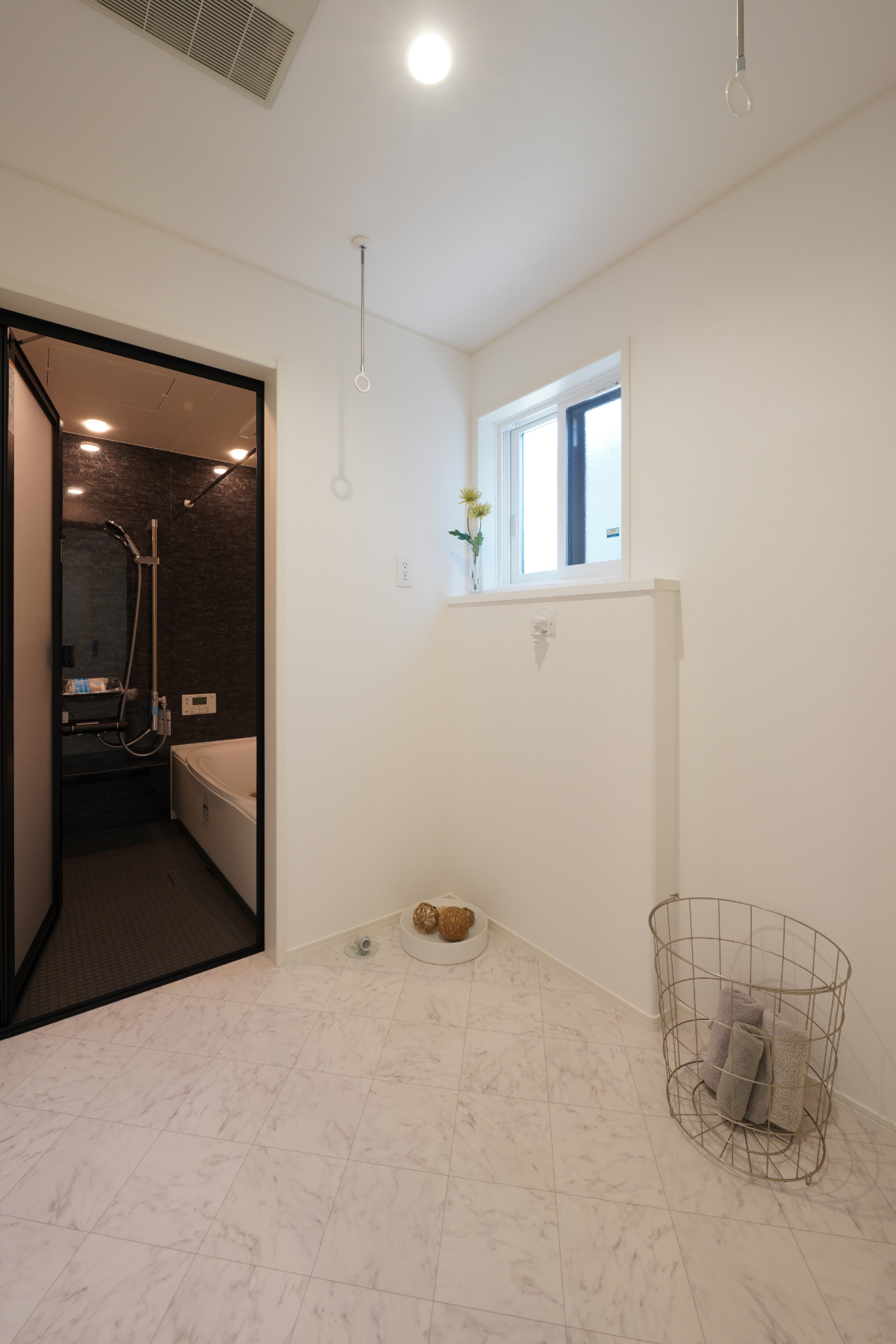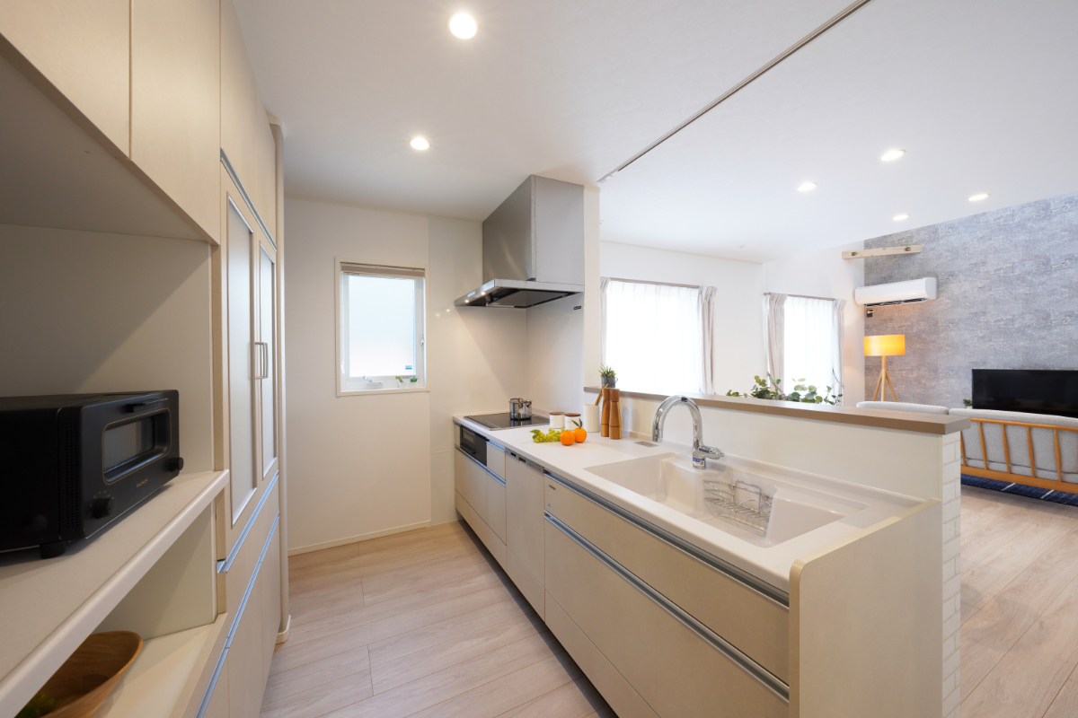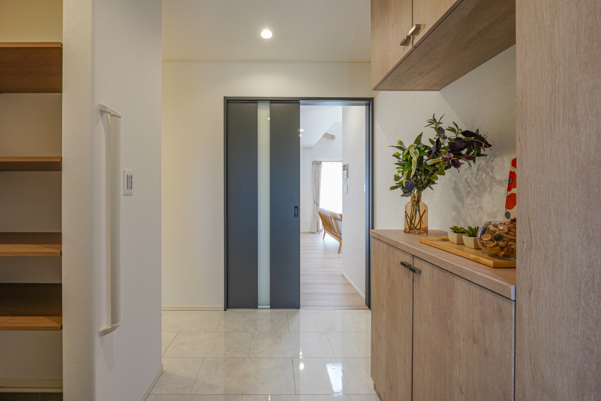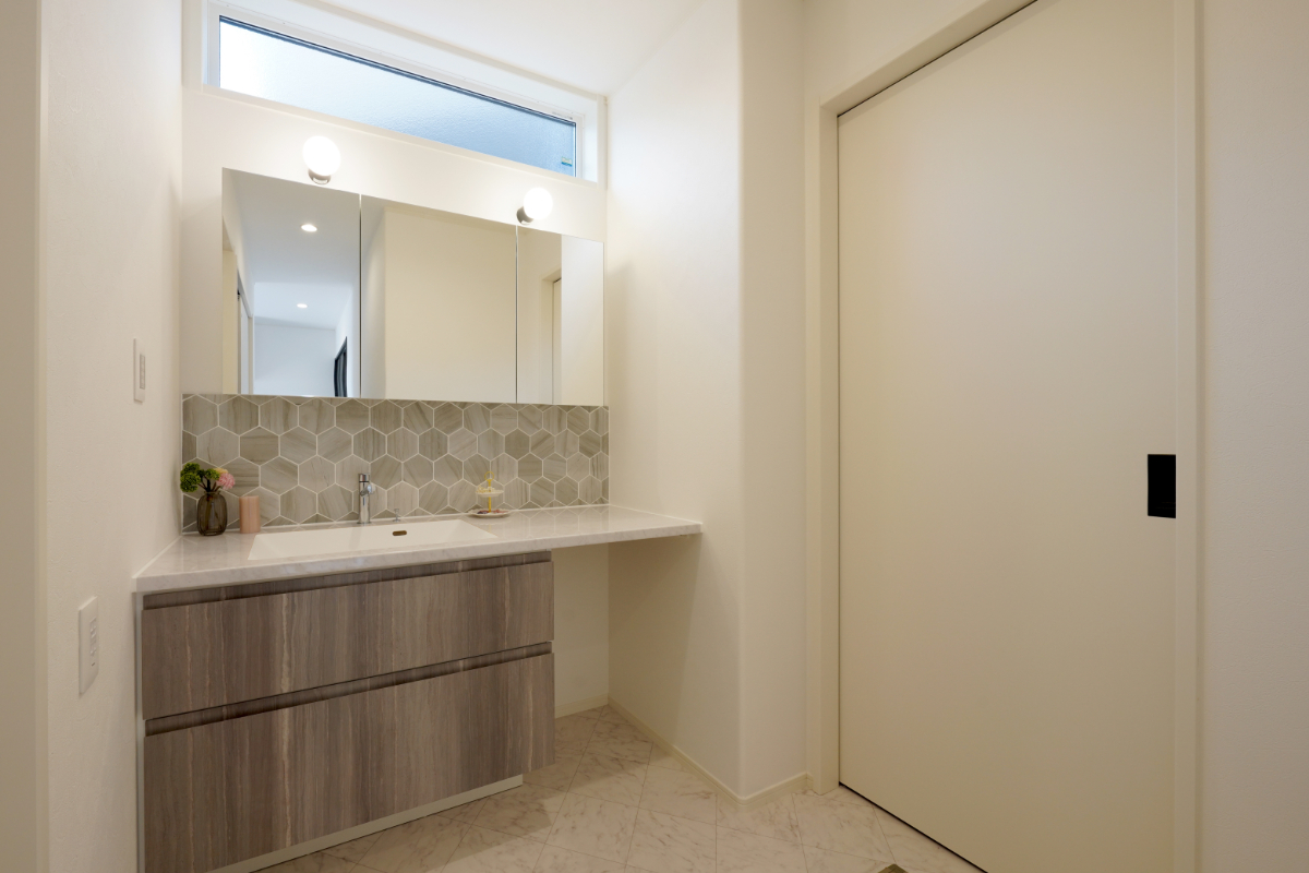 小上がりの和室からリビングが見渡せる設計や、ヘキサゴンタイルが可愛い造作風の洗面化粧台、そして広々としたランドリースペース。デザイン性だけでなく、日々の暮らしやすさが計算されています。
