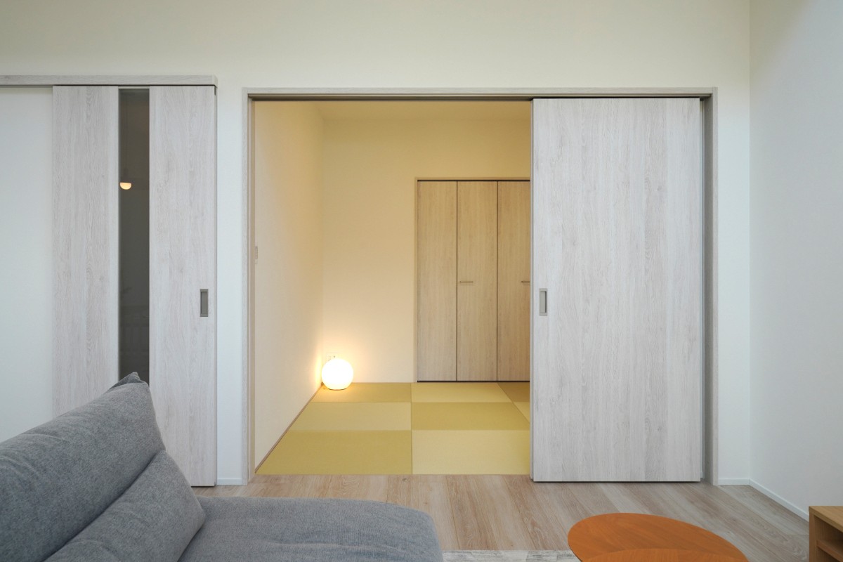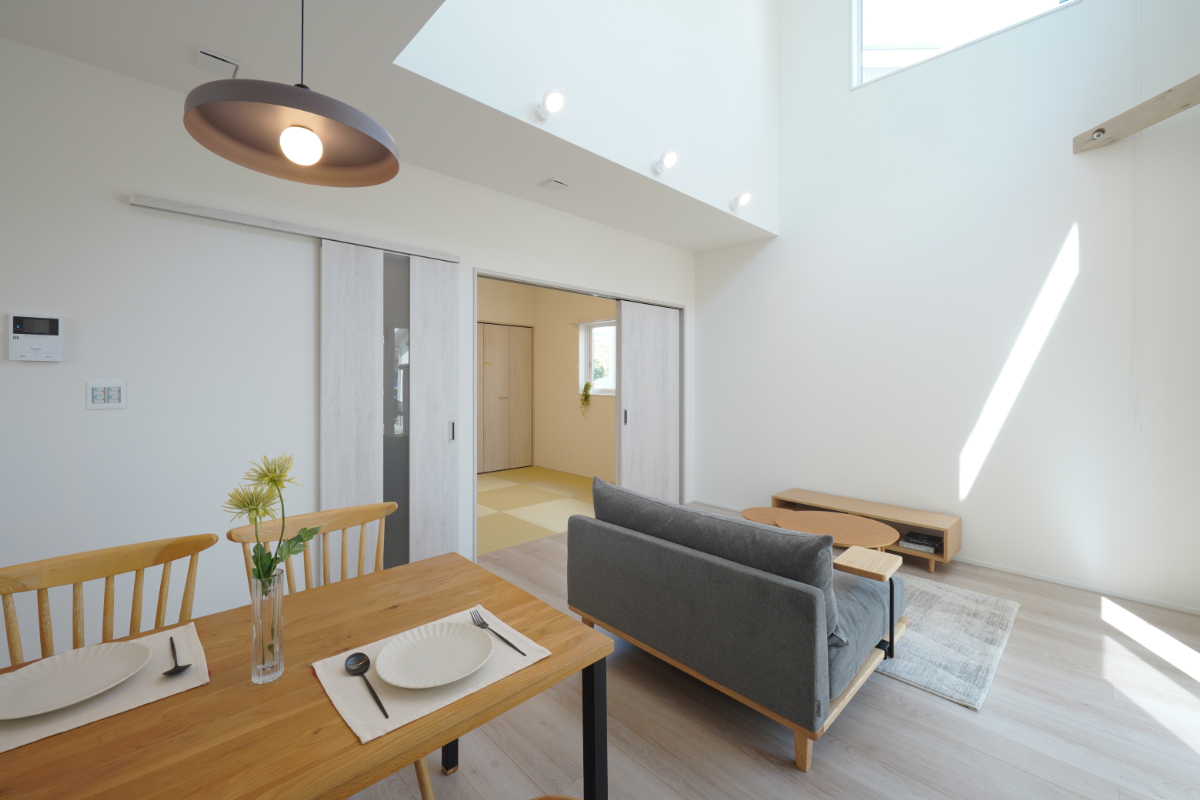 リビング上部に広がるダイナミックな吹き抜けが、住まい全体に光と開放感をもたらしています。リビング横の和室の扉を開け放てば、さらに奥行きが生まれる設計。
