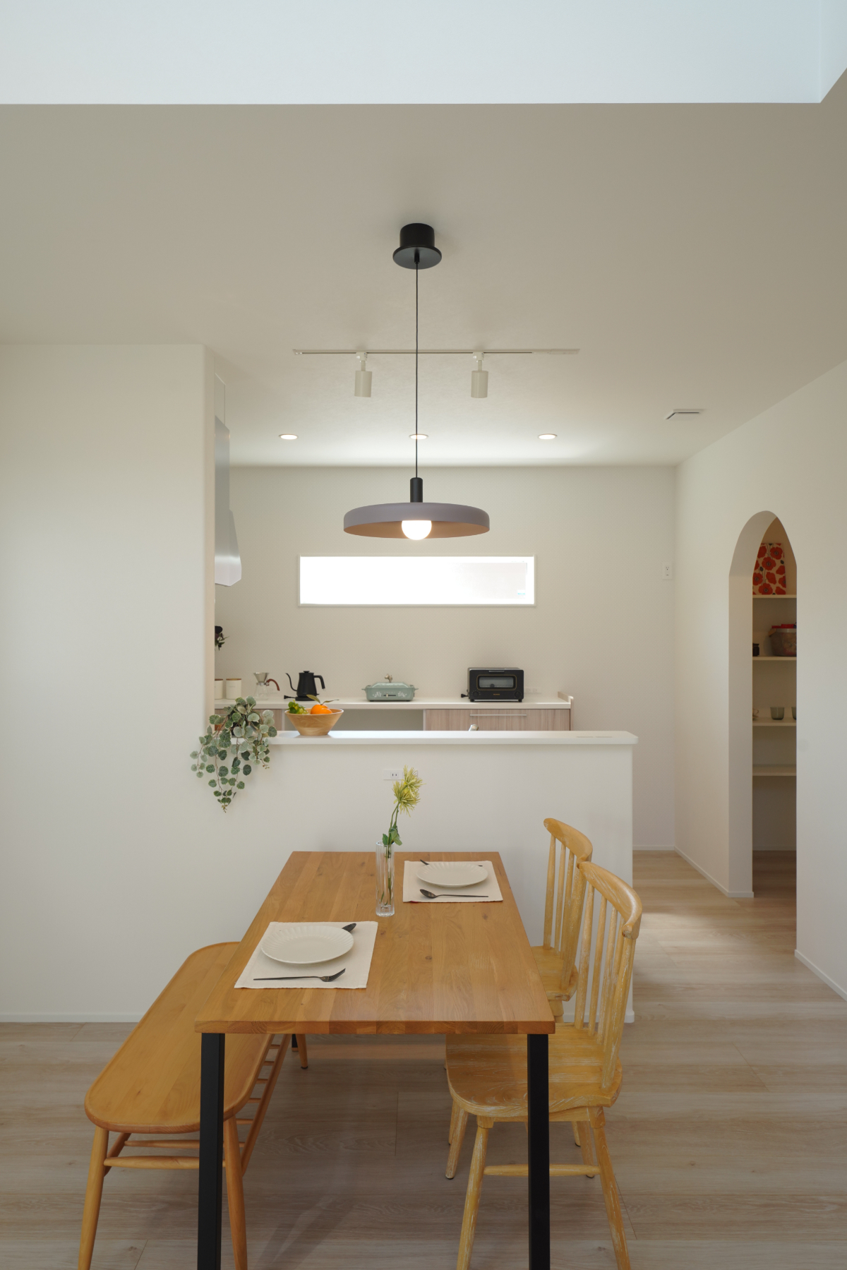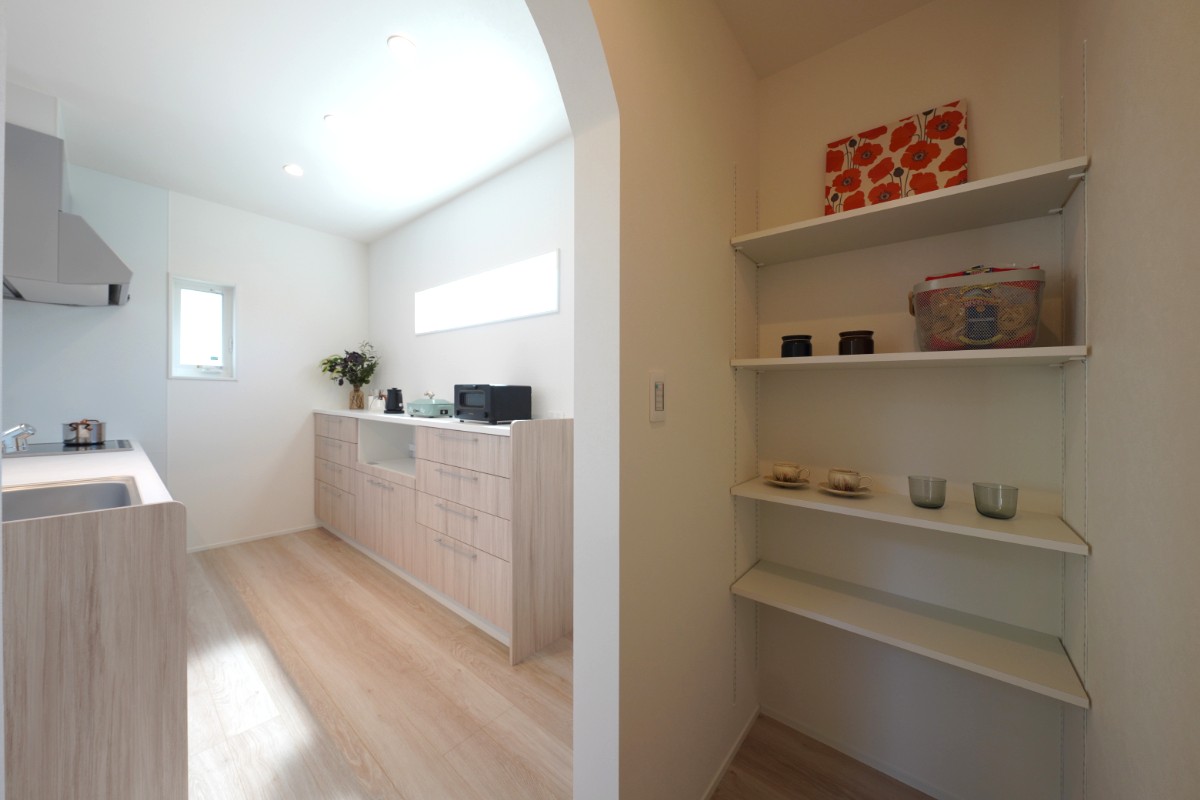 キッチン横のパントリーやウォークインクローゼットの入り口に、可愛らしい「アーチ壁」を採用。実用的な収納スペースを、インテリアのアクセントとしておしゃれに演出しています。