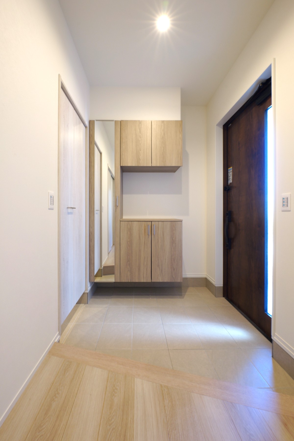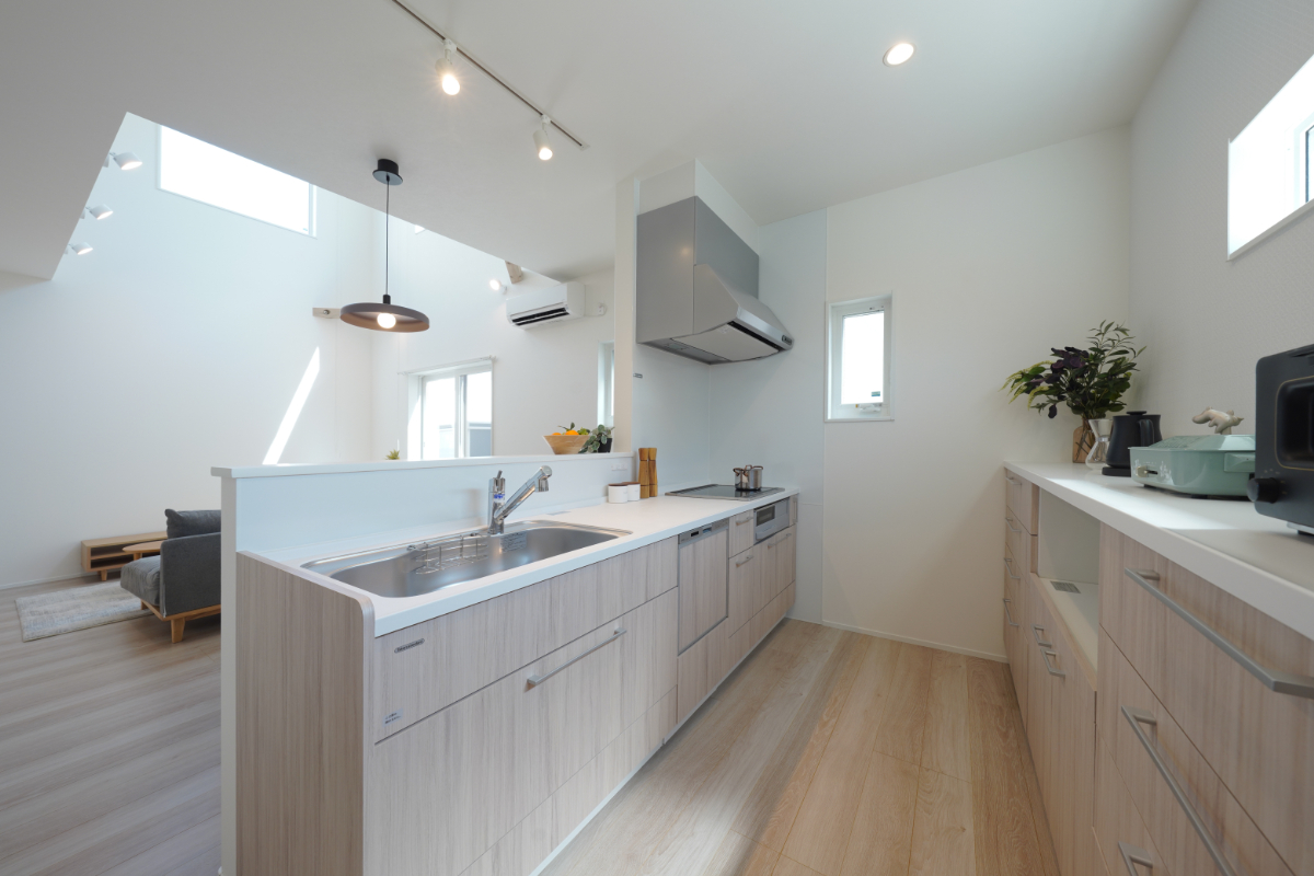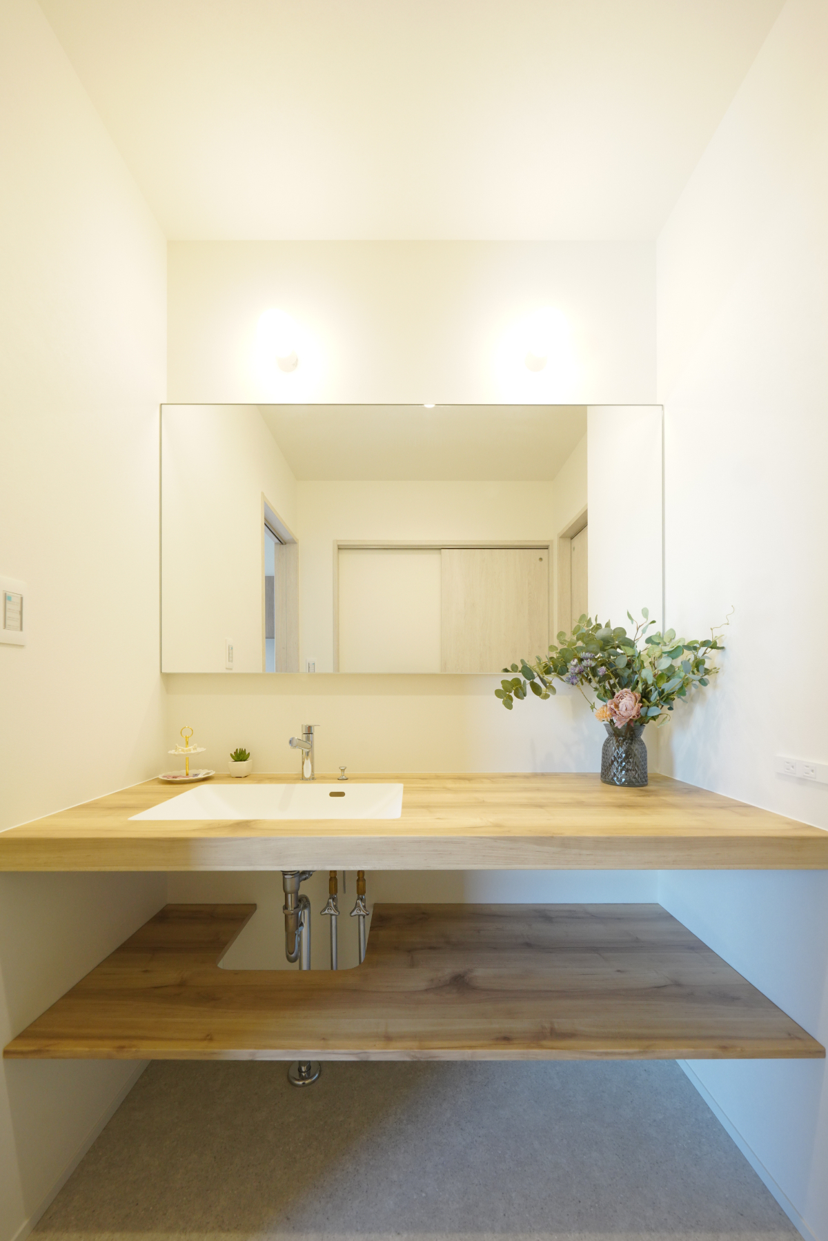 鏡を大きく取り、足元をスッキリさせた幅広の洗面カウンターは、まるでセレクトショップやカフェのような仕上がり。忙しい朝も二人並んで使えるゆとりが、日々の暮らしにゆとりを生みます。